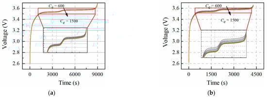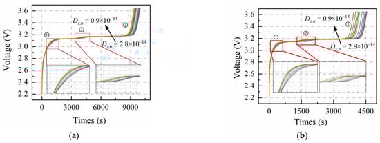 Figure 4 and Figure 5 show the sensitivity of De and Ce to constant-current charging voltage, which presents similar results. The larger current rate causes the voltage curve dispersion to increase, which means PDe and PCe are easily identified under the larger rate constant-current charging condition. The sensitivity of De and Ce to the voltage curves is different from Qn and Ds,n, which means PCe, and PDe can be identified at the same constant-current charging condition.