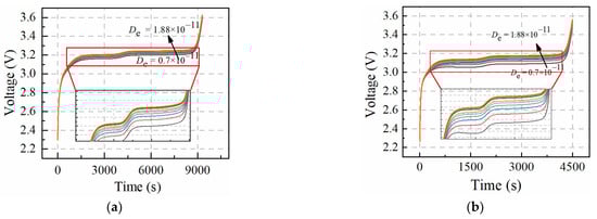 Sensitivity curves of battery terminal voltage to De under different charging rates. (a) Sensitivity curves under 0.5 C charging rate; (b) Sensitivity curves under 1 C charging rate.