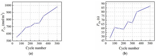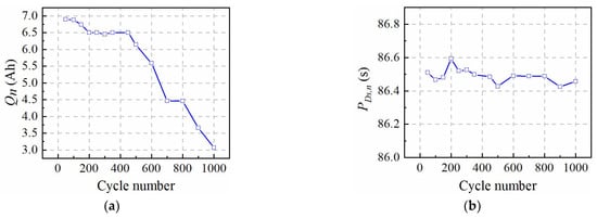 In order to verify the accuracy of the proposed micro-health parameter identification method, the aging tests of 32,650 cylindrical LiFePO4/C are carried out under the condition of the 1 C charge-discharge cycle. Based on the identification strategy proposed in Section 3, the identification result of micro-health parameters including Qn, PDs,n, PDe, and PCe under 1 C constant-current charging condition is plotted in Figure 7 and Figure 8. As the aging degree of the battery intensifies, the negative electrode material of the tested battery is lost, but the diffusion capacity of lithium ions inside the negative electrode active particle has not changed significantly. For the electrolyte, it was apparent that as the battery aging degree intensifies, the lithium-ion diffusion capacity in electrolyte shows a weakening trend, while the electrolyte concentration shows an increasing trend, which is caused by the side reactions inside the battery that consumes the solvent in the electrolyte during the aging process.