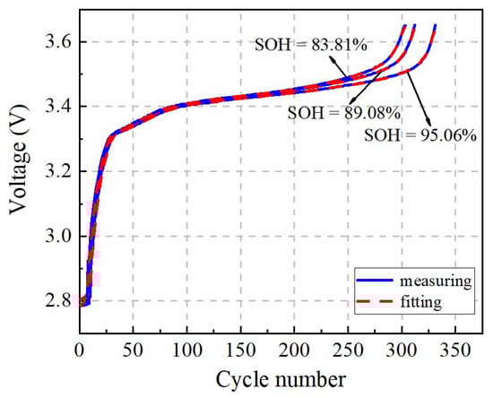 To verify the identification results of the micro-health parameters PDe and PCe, Figure 10 shows that the simulation curve on the basis of the identified parameters can fit well with the measurement curve, which means PDe and PCe are accurately identified. Table 4 compares the identification time in our study and other research in Refs. [30,31]. Although the number of identified parameters is reduced, our study shortens the identification time of the characteristic parameters that characterize the health of the battery’s negative electrode material and electrolyte, and avoids the design of complex parameter identification conditions.