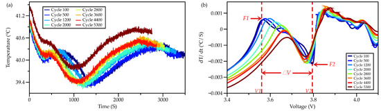Figure 5b shows the DT curve of cell 1 under different aging states. Overall, the DT curve can be divided into three parts: (1) The DT curve first undergoes a period of rapid ascent, reaching its first peak value (denoted as F1); (2) After that, it undergoes a sharp decline and reaches its first valley value (denoted as F2); (3) Then, it experiences a rapid increase. Note that the DT curve represents the temperature change rate during the charging process. Thus, the entire DT curve shows a particular trend with the SOH decreases. Specifically, the first peak value, F1, gradually decreases, and the voltage corresponding to F1 (denoted as V1) increases with the SOH decreases. Moreover, the voltage corresponding to the valley value F2 (denoted as V2) gradually declines with the SOH decreases, but the valley value F2 does not show a clear upward or downward trend. In addition, the voltage difference between F1 and F2 (denoted as ΔV) shows a decreasing trend. As for the third part, although the DT curve shows an overall increasing trend and then declines, health features are not noticeable. Overall, the first and second parts of the DT curve present an obvious change with the SOH decreases. Therefore, the peak value F1, the voltage corresponding to F1, the voltage corresponding to F2, and the voltage difference ΔV between them, are chosen as HFs to describe the battery degradation.