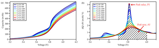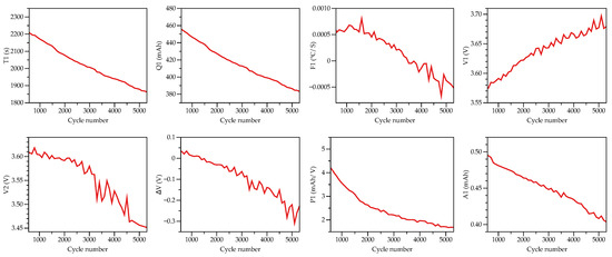 As shown in Figure 6b, there are two peaks in the IC curve’s middle range (e.g., 3.4–4.0 V), and each peak can reflect the phase change inside the LiBs during the charging process with a 1-C charging rate. It can be found that the area under the peaks decreases with the cycle increases, indicating LAM and LLI [21]. In addition, the peak values decrease with a clear trend. Note that compared with the first peak (between 3.5 V and 3.7 V), the second peak (between 3.7 V and 4.0 V) shows a more noticeable trend during the aging process. Therefore, the value of the second peak (denoted as P1) and the area under the second peak between 3.7 V and 4.0 V (denoted as A1) are chosen as HFs to describe the degradation of battery capacity.