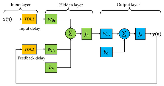 NARXNN is a sort of RNN that can learn to predict one time series by means of giving past values of the same time series and another time series called the external or exogenous time series. The structure of NARXNN is depicted in Figure 8, where TDL represents the time–delay line. According to the feedback mechanism of NARXNN, it can be regarded as a variant of the Jordan NN [50]. The expression of NARXNN is as follows: