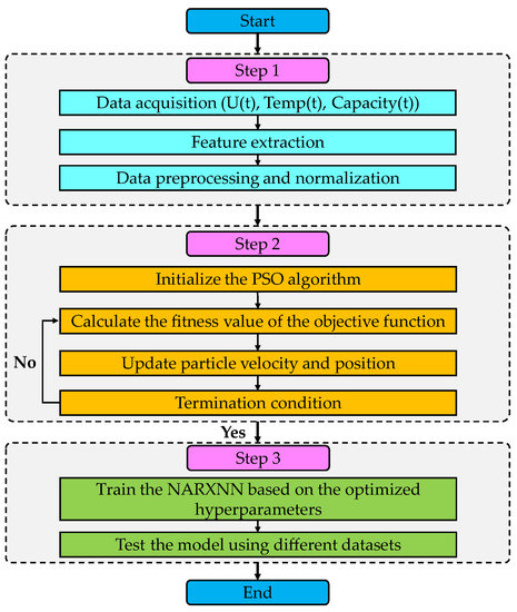 Nonlinear autoregressive with exogenous input neural network (NARXNN) is a subclass of the recurrent neural network (RNN), which is suitable for predicting complex and nonlinear systems [39]. Compared to other RNNs, such as the LSTM and GRU, the NARXNN has a more straightforward structure, fewer parameters, and reasonable accuracy. Although many researchers employed the NARXNN for state of charge (SOC) estimation [40,41,42], only a few researchers applied it for SOH estimation. For example, Khaleghi et al. [43] utilized the open-mode NARXNN to capture the dependency between the HFs and battery SOH. In another work, Cui et al. [11] built the closed-mode NARXNN to estimate the battery SOH. Moreover, the existing methods have used a time-consuming trial-and-error approach for finding the appropriate hyperparameters, which is inefficient. Recently, an effective strategy for hyperparameter tuning has been to combine data-driven algorithms and heuristic optimization techniques. For example, Ren et al. [44] utilized the particle swarm optimization (PSO) algorithm to optimize the number of hidden neurons, the learning rate, and the maximum epochs of the LSTM. Zhang et al. [45] employed the PSO algorithm to optimize the kernel parameters (w and σ) of the RBFNN. Hossain et al. [46] used the gravitational search algorithm (GSA) to find the best number of hidden neurons of the ELM. Compared with other heuristic optimization techniques, the PSO algorithm has the advantages of easy implementation, strong robustness, and global exploration. Therefore, this paper attempts to use the PSO algorithm to find the best values of input delays, feedback delays, and the number of hidden neurons of the NARXNN. Then the NARXNN is employed to build a multi-feature-based SOH estimation model. In summary, the main contributions of this paper are as follows: