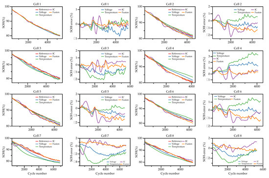 Overall, the fusion feature-based method can obtain accurate and robust estimation results under all testing datasets. In contrast, single feature-based methods can only achieve acceptable estimation results on specific testing datasets. For example, the temperature feature-based method can obtain great estimation accuracy for cell 2 and cell 5 with the MAEs less than 0.3% and RMSEs less than 0.4%. However, the estimation results of other cells are the worst, where the MAEs of cell 3, cell 4, cell 7, and cell 8 are 1.24%, 1.96%, 2.82%, and 1.56%, respectively, while the RMSEs are 1.35%, 2.27%, 3.04%, and 1.80%, respectively. Moreover, the MaxE of cell 7 exceeds 4%, which is unacceptable. The DT curve can reflect the thermodynamic characteristics of LiBs during the degradation process. However, the differential operation may magnify the noise in measurement, and the filtering algorithm may influence the feature extraction process. Thus, only using the temperature feature cannot obtain accurate and robust estimation results for all testing datasets. Regarding the voltage feature, the overall estimation performance is better than the temperature feature, according to the error curves in Figure 11. However, only using the voltage feature cannot guarantee the estimation robustness under different testing datasets. It can be seen that the MAE of cell 6 achieves the lowest value, while the MAEs of cell 4 and cell 7 exceed 1%. The MaxEs of cell 4 and cell 7 exceed 2%. Regarding the IC feature, the IC curve can describe the electrochemical characteristics of LiBs during the aging process. It can be seen that the overall SOH estimation results based on the IC feature are better than the temperature and voltage features, especially for cell 3, cell 4, cell 7, and cell 8. However, compared with the fusion feature-based method, the error curves of the IC feature-based method show more fluctuations, resulting in larger RMSEs and MaxEs, where the MaxEs of cell 2, cell 5, and cell 7 exceed 2%. Finally, the multi-feature extraction strategy can fully use the advantages of different kinds of features and avoid their disadvantages, resulting in more accurate and robust estimation results. It can be seen from Figure 12 that although the MAEs of the fusion feature-based method for cell 2 and cell 5 are not the lowest, it remains within 1%. Moreover, the fusion feature-based method can obtain the best estimation performance for other cells. The average MAE of the fusion feature-based method is 0.47%, which is 57.79%, 35.63%, and 22.73% lower than the temperature, voltage, and IC feature-based methods, respectively. As such, the effectiveness of the proposed multi-feature extraction strategy is verified based on the above analysis.