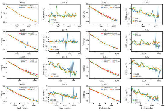According to the SOH estimation curves shown in Figure 13, the estimated SOH of the three methods can generally follow the aging path. However, the SOH curves estimated based on the PSO-NARXNN method have better consistency and smoothness with the real SOH trajectory. In contrast, the estimated curves based on the BPNN and conventional NARXNN methods show different degrees of fluctuations. Specifically, regarding the BPNN method, the MAEs of all cells are less than 1%, and only the RMSE of cell 2 exceeds 1%, indicating 1.10%. Moreover, the MAEs of cell 4 and cell 5 achieve the lowest values among the three methods. Therefore, the effectiveness of the proposed multi-feature extraction strategy is further verified because a simple BPNN can obtain a relatively satisfactory estimation performance. However, the MaxEs of the BPNN method are all larger than 2%, and the estimated SOH curves show significant fluctuations, especially during the EOL of LiBs, according to the error curves in Figure 13. As a result of the fluctuation, the BPNN method has an average MAE and RMSE of 0.64% and 0.84%, which are larger than the other two methods. Regarding the conventional NARXNN method, it can achieve an overall better performance in comparison to the BPNN method. Especially, the estimation errors of cell 3 and cell 7 are reduced to a larger extent. The average MAE is 0.60%, 6.7% lower than the BPNN method. Moreover, the average RMSE is 0.70%, which is 16.7% lower than the BPNN method. In addition, according to the error curves in Figure 13, the MaxEs of the conventional NARXNN method are all less than those of the BPNN method, showing a more robust estimation result. This is because the feedback mechanism of the NARXNN can learn information from the past values of output and previous values of exogenous input data. Regarding the PSO-NARXNN, it can be seen from Figure 14 that all MAEs and RMSEs are reduced in comparison to the conventional NARXNN. The error curves in Figure 13 also demonstrate that the PSO-NARXNN has an overall better estimation performance than the conventional NARXNN. The MAE of cell 3 reaches the lowest value, 0.17%. The average MAE and RMSE are 0.47% and 0.56%, which are 21.67% and 20% lower than the conventional NARXNN method and 26.56% and 33.33% lower than the BPNN method. Therefore, the effectiveness of the PSO algorithm is verified.