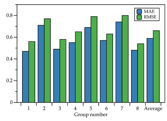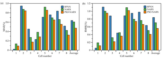As explained at the beginning of Section 4, there are eight experimental groups to comprehensively evaluate the effectiveness of the proposed multi-feature extraction strategy and PSO-NARXNN model. Section 4.1.2 and 4.1.3 has discussed the experimental results of group 1, which uses the aging dataset of cell 1 to train the model, and then the aging datasets of the other seven cells to test it. In this section, the results of other experimental groups are explained. Owing to space limitation, the average MAE and RMSE of 7 experimental groups are given in Table 5, and Figure 15 intuitively compares them.