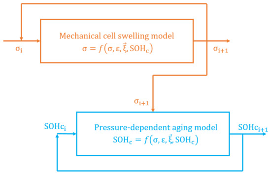 In the previous Section 2.2, the electro-chemo-mechanical equation for homogenous pressure development taking into account cell expansion due to aging was derived. The pressure-induced characterization methods were shown that were consistent with mechanical model. However, the basic hypothesis is that the aging behaviour over the lifetime is invariant of the characterization process. To model the pressure-dependent aging, a semi-analytical aging model of the following form is used