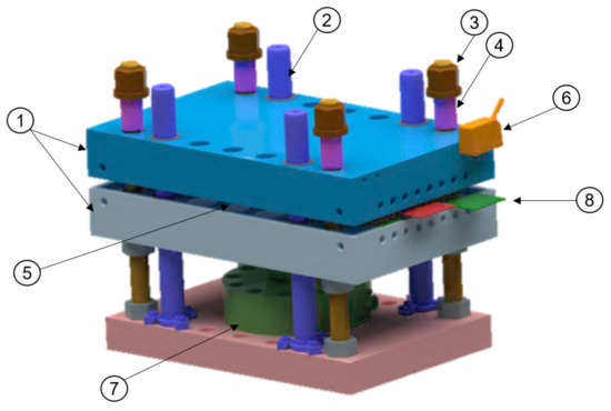 Representation of the jig setup. The cell (5) is inserted into two large aluminium plates (1) which are supported by compression springs (4), threaded rods (3) and guide columns (2). The force is measured by a force box (7), which is mounted under the intermediate plate and measures a force via the vertical displacement of the plates. The design criteria for the plates are to minimise deformation and to ensure a homogeneous pressure distribution across the cell. The thickness is increased by measuring the distance between the plates. This is done using a laser sensor (6). To measure the distance from the outside, an insert plate (8) is placed under the cell.