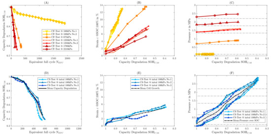 In the following, the aging measurements are presented in relation to the mechanical preload conditions. In order to distinguish the type of test, the constant force measurements are abbreviated as CF tests and the constant stiffness measurements are abbreviated as CS tests. The evaluations are also shown separately. In Figure 5 the results of the constant force tests and from D to F the results of the constant stiffness measurement are shown in Figure 5A–C. Figure 5A,D shows capacitance degradation over the equivalent full cycle. Figure 5B,E shows irreversible cell growth using strain over capacitance degradation and Figure 5C,F shows pressure evolution over capacitance degradation.