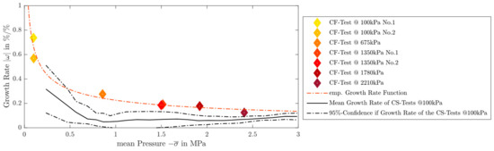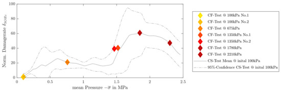 Figure 6 below shows the damage rate over the mean applied pressure. The CF measurements result in discrete points, since the damage rates and the pressure per test are constant, whereas the CS tests show continuous trajectories because the pressure increases and the slope changes constantly.
