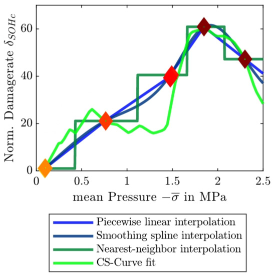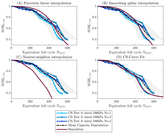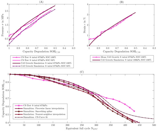 The reason for this is that in the pressure range from 0.1 to 1.5 MPa (according Figure 5C) only 1 constant force measurements are available at 0.675 MPa @ = 30%. The course of the empirical growth rate function shows the greatest sensitivity to pressure due to the equation and the regression. This results in a direct influence on the growth rates and the electrochemical modulus of elasticity and, in addition, a direct error propagation on the pressure development and on the coupled lifetime simulation. In Figure 11B shows the strain of the cell at = 100% of the mean strain from the CS measurement. It can be seen that the deviations in the print are not present here. Figure 12 shows the lifetime simulations based on the different interpolation variants (see Section 4.1). The direct influence of the interpolation variant of the CS measurement can be seen. The interpolation methods in Figure 12A,B are only slightly different, but this is also evident from the evaluation in Figure 7. The “Nearst-neigbor approach” differs significantly, as it has the largest deviation and is the most conservative approach. The large deviation is due to the fact that, the damage rate is increased abruptly after 0.5 MPa (cf. Figure 7) is exceeded, resulting in a high damage being applied earlier than in the other interpolation methods. Using CS-Curve Fit as the interpolation method shows the smallest deviation, which is to be expected as it only includes the deviation from the pressure prediction model. In addition, the error propagation from the pressure development simulation is significant on the aging simulation. This results to the largest deviation in the range = 80 to 90%. In order to quantify the quality of the simulation and the interpolation methods, error measures are determined in relation to the number of cycles The mean deviation or residual