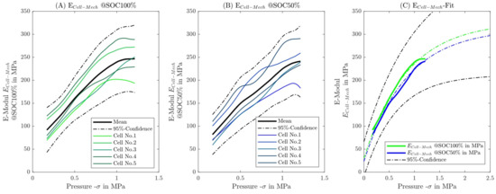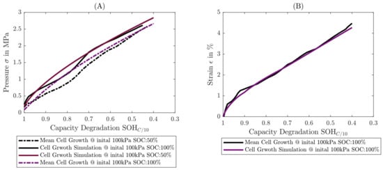 For further validation of the model, a second independent validation measurement was performed. The initial pressure was increased to 675 kPa at a of 30%. The aim is to investigate how well the change preload force can be mapped with the model. The next higher pressure level (cf. Figure 5) selected from the present constant force measurements. Figure 13A shows the measured pressure evolution at = 100% and at the average = 50% compared to the simulation. It can be seen that there is a very high overlap between simulation and measurement. The biggest deviation is initial. The reason for this is that the growth rates only describe the stationary growth area and not the initial usually nonlinear growth. On the other hand, the change in the state of charge also influences the modulus of elasticity as well as the growth rates. In the model, only the measurements at a of 100 and 50% are available.
