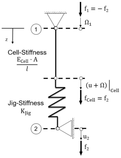 For a discretion of the full cell by a cell element with linear test function, the following global stiffness matrix for the full cell results. Figure 10 shows this schematically, both the cell (indicated as a rod element) and the jig (indicated as a spring element) experience the identical force.