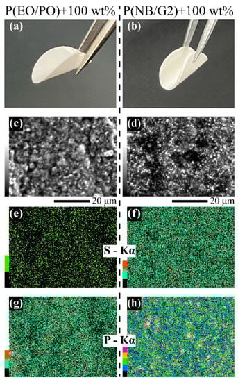 Photographs of P(EO/PO) + 100 wt% LICGC (a) and P(NB/G2) + 100 wt% LICGC (b). Cross-sectional SEM images of P(EO/PO) + 100 wt% LICGC (c) and P(NB/G2) + 100 wt% LICGC (d). EDX mapping images for S (e,f) and P (g,h) in P(EO/PO) + 100 wt% LICGC and P(NB/G2) + 100 wt% LICGC (EO = ethylene oxide; PO = propylene oxide; LICGC = Li1+x+yAlxTi2−xSiyP3−yO12; SEM = scanning electron microscopy; NB/G2 = norbornene/di-methylene-glycol di-methyl ether; EDX = energy-dispersive X-ray spectroscopy).