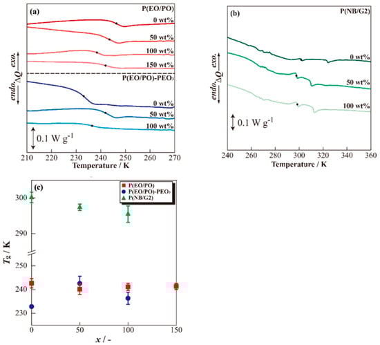 Figure 2a shows the DSC thermograms of P(EO/PO)/LICGC and P(PO/EO)-PEO3/LICGC. Each sample experienced a thermal transition at the Tg of the polymer electrolyte, i.e., at approximately 230–250 K. Figure 2b shows the DSC thermograms of the P(NB/G2)/LICGC hybrid electrolyte. Each sample experienced a slight thermal transition at approximately 260–280 K, which was attributable to the thermal vibration of the ether chain in the G2 unit. The G2 unit may require less energy for molecular motion than the NB unit. Therefore, the thermal vibrations occurred at low temperatures and may not have appeared as clear thermal transitions. Furthermore, in contrast to the PEO-based composite solid electrolytes, each P(NB/G2) electrolyte exhibited a heat capacity change, which could be attributable to the glass transition of the NB unit at 290–310 K. The Tg reflects the properties of the host polymer in the composite solid electrolyte. There was a heat capacity change at approximately 310–330 K, which may be attributed to the softening of the NB unit. Figure 2c shows the relationships between x and Tg in the fabricated P(EO/PO)/LICGC, P(EO/PO)-PEO3/LICGC, and P(NB/G2)/LICGC samples. The order of Tg for x = 0 (pure polymer electrolyte) was P(EO/PO)-PEO3 < P(EO/PO) < P(NB/G2)/LICGC, and the Tg of P(EO/PO)-PEO3 was approximately 10 K lower than that of P(EO/PO). The decrease in the Tg may be attributed to the slight increase in the free volume of the polymer phase caused by the introduction of highly mobile low-molecular-weight free chains. In addition, the Tg value of P(NB/G2) was more than 50 K higher than the values of the PEO-based electrolytes. Physically cross-linked P(NB/G2) is considered more thermally stable than chemically cross-linked polymers consisting mainly of EO units, because the hard physical cross-linking points of the NB units and the soft ion conducting G2 units provide an intramolecular phase separation framework. The Tg values of the P(EO/PO)-PEO3/LICGC samples did not change significantly with the LICGC concentration, suggesting that the free volume and segmental motion were maintained [33,34]. The Tg of P(NB/G2)/LICGC decreased slightly with the LICGC concentration; the introduction of LICGC particles into P(NB/G2) may have increased its free volume and decreased its Tg by changing its surface properties. Therefore, the difference in the Tg values between PEO-based composites and P(NB/G2)/LICGC solid electrolytes is considered an indication of differences between the polymer structures of their hosts.
