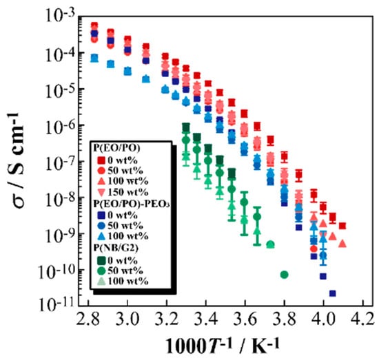 Figure 3 shows the relationship between the temperature and σ in P(EO/PO)/LICGC (Table S1), P(EO/PO)-PEO3/LICGC (Table S2), and P(NB/G2)/LICGC (Table S3). The majority of ionic conduction occurred in the polymer phase because σ had a non-Arrhenius temperature dependency similar to that of pure PEO-based solid electrolytes at high temperatures. The σ of P(EO/PO)/LICGC decreased with the LICGC concentration over the entire temperature range. We considered that a polymer–particle interface formed within P(EO/PO)/LICGC; the resistance can be attributed to the grain boundaries between the LICGC particles (RGB), which contributed to the decrease in σ. In addition, the temperature dependence of σ in the low-temperature range tended to be linear. This behavior implies that Li+ was preferentially conducted in the LICGC phase [30] in the low-temperature range.