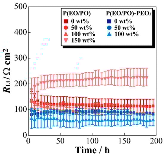 where Rb is the bulk resistance of the electrolyte, and QLi and RLi are the capacitance and resistance caused by the charge transfer of Li+, respectively. The RLi values of both composite solid electrolytes remained almost constant for approximately 200 h, and a stable interface formed with the Li metal electrode. Although polyether-based polymer solid electrolytes form stable interfaces with Li metal electrodes by virtue of their high electrochemical stability, the Ti in LICGC reportedly forms an unstable interface by reacting with Li metal [35]. In the present study, the LICGC particles in the composite solid electrolytes were covered by the polymer phase, which prevented direct contact with the Li metal electrode, and would have formed a stable interface. This suggests that even a composite solid electrolyte containing Ti may be applicable to an all-solid-state battery containing a Li metal electrode. In addition, the RLi of the P(EO/PO)/LICGC sample had a minimum value at x = 100, and the maximum value at x = 150 corresponded to a slight side reaction in the LICGC phase. In the case of a relatively low LICGC concentration of x = 0–100, the continuous phase of LICGC formed close to the electrolyte–Li metal interface, and may have promoted Li+ transport and reduced the RLi. Furthermore, when PEO3 was introduced, the RLi values were slightly lower when x = 50 or 100 than when x = 0. This implies that the enhancement of Li+ transport at the polymer/LICGC particle interface contributes to a reduction in RLi.