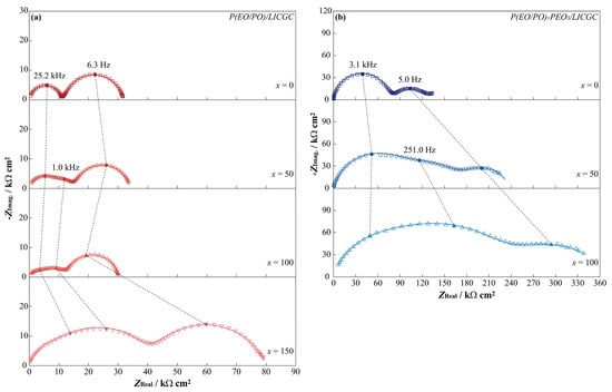 Figure 5a,b shows the Cole–Cole plots of [Li|P(EO/PO)/LiCGC|Li] (a) and [Li|P(EO/PO)-PEO3/LiCGC|Li] (b) symmetrical cells at 288.15 K. Both of the Rb values in the high-frequency range and RLi at the electrolyte–Li metal interface in the low-frequency range were observed in the Cole–Cole plot of the system when x = 0. The time constants of Rb and RLi were kHz order and about 5–10 Hz, respectively, and were calculated when this spectrum was fitted using the equivalent circuit described by Equation (2):
