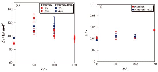 Figure 6a shows the dependence of the apparent activation energy (Ea) values of RGB and RLi on x. P(EO/PO)/LICGC had the highest Ea,Li value when x = 50, but the value decreased as x increased. This suggests that the continuous LICGC phase formed near the electrolyte–Li metal electrode interface as x increased, and this continuous phase promoted Li+ transport. The Ea,GB decreased as x increased (x = 50:127 kJ mol−1; x = 150:96 kJ mol−1). This was caused by an increase in the LICGC continuous phase in the electrolyte as x increased, which facilitated Li+ transport. The decreases in Ea,Li and Ea,GB indicate that LICGC is a promising material that could enhance the output characteristics of all-solid-state batteries. However, the Ea,Li of P(EO/PO)-PEO3/LICGC increased up to x = 50 as the LICGC content of the composite increased, and decreased slightly thereafter. Figure 4 reveals that the RLi decreased in the composite, and the introduction of PEO3 may have promoted the frequency factor associated with the electrolyte–Li metal electrode interfacial reaction.