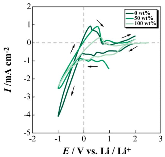 Figure 7 shows the cyclic voltammograms of [Li|Ni] cells obtained using P(NB/G2)/LICGC composite electrolytes. In all compositions of P(NB/G2)/LICGC, the reduction currents observed during the reduction processes were attributed to a deposition reaction of the Li (less than 0 V versus Li/Li+). Furthermore, clear oxidation peaks attributable to the dissolution reaction of the deposited Li were confirmed, and the Coulombic efficiencies at x = 0, 50, and 100 were calculated to be 18.6%, 39.1%, and 21.9%, respectively, from the area ratios of the current peaks related to the Li deposition/dissolution reactions. Because the Coulombic efficiency increased as x increased, the introduction of LICGC to P(NB/G2) may have suppressed irreversible reactions. This suggests that P(NB/G2)/LICGC acts as a Li+-conducting solid electrolyte and has potential for use in all-solid-state batteries.