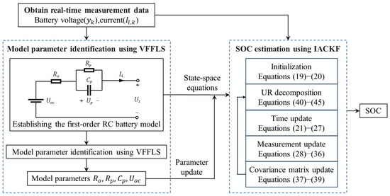 Finally, the overall flowchart of the proposed SOC estimation method is summarized in Figure 2. First, the first-order RC model parameters are identified online using the VFFLS algorithm in Section 2.2. Then, based on the parameter-updated state-space equations in Equation (15), the battery SOC is estimated using the improved ACKF algorithm in Equations (19)–(45).