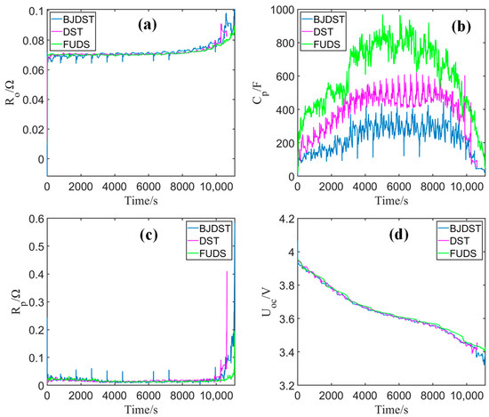 It has been demonstrated that when the input data have poor dynamics, the single forgetting factor will forget the old history data completely. In this case, if there is no new dynamic data inputting the system, then the covariance matrix will increase exponentially, resulting in very high sensitivity of the FFRLS algorithm to noise [49]. In addition, it is very difficult for a single forgetting factor to accommodate multiple parameters with different ranges and change rates. For example, the OCV varies gradually with a SOC in the range of about 2 V, Ro is nearly constant in the moderate SOC range while changing a few mΩ at both a low and high SOC, and Cp changes hundreds or even thousands of F which is highly dependent on the dynamics of driving cycles. These different dynamic features necessitate deploying multiple forgetting factors in the parameter identification. Nevertheless, it is clear from Equation (11) that the classical FFRLS considers that each component of the parameter vector varies at similar rates. Consequently, if there is a divergence in estimating one parameter, the same correction will be applied to all the other parameters, causing estimation overshoot or undershoot [36].