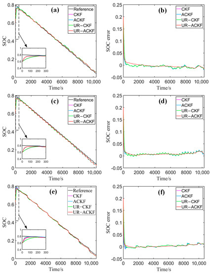 The SOC estimation results of CKF family algorithms in a positive definite situation: (a,b) BJDST cycle; (c,d) DST cycle; (e,f) FUDS cycle.