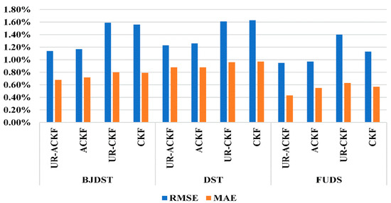 In addition, it can be seen from Figure 6 that the adaptive algorithms converge faster and the estimated SOC is more accurate compared with the non-adaptive algorithms, which can also be observed clearly from the statistical error results in Figure 7. For example, under the BJDST condition, the RMSE and MAE of UR-ACKF are 1.14% and 0.68%, respectively, while those of UR-CKF are 1.59% and 0.80%, respectively. This indicates that the CKF algorithms are unable to eliminate the impact of inaccurate initial parameters if the noise covariance matrices are not self-corrected, resulting in disordered changes in the SOC estimation error. Unlike the CKF, the ACKF algorithms present relatively orderly changes in estimation error, and they perform better in following the variations of the referenced SOC. Particularly, the proposed UR-ACKF algorithm achieves a RMSE of within 1.23% and a MAE of under 0.88%.