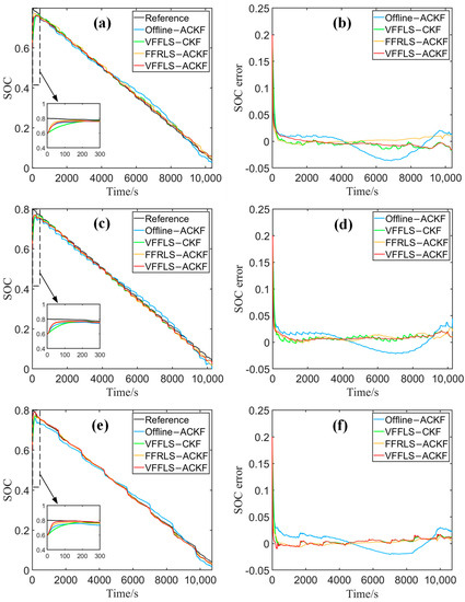 It is also clear from Figure 8 that the SOC values estimated by the algorithm based on offline parameter identification deviate significantly from the references compared with those using the online parameter identification and are subjected to more fluctuation. Taking the BJDST cycle as an example, the RMSE and MAE of the VFFLS-ACKF are lower at 1.18% and 0.68%, respectively, while those of the offline-ACKF reach 2.10% and 1.65%, respectively, which are significantly larger than the former. This is because the internal parameters of LIBs vary continuously in practical working conditions. The online parameter identification can update the model parameters of LIBs correctly, so it can improve the accuracies of the battery model and SOC estimation.