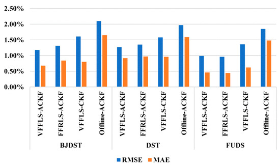 In real-world applications, the situation of a non-positive definite error covariance matrix is likely to occur because of rounding and discretizing operations in hardware. Therefore, to simulate this situation, herein the error covariance matrix is initialized to be non-positive definite, as shown in Equation (49), and other conditions are kept unchanged. In this case, the Cholesky decomposition will fail to decompose the non-positive definite matrix, thus the CKF-family algorithms based on Cholesky decomposition no longer work. As a result, this section compares four different algorithms based on UR decomposition. To better reveal the advantages of the proposed SOC estimation method, in addition to the proposed VFFLS-ACKF, there is also the CKF based on the improved VFFLS parameter identification (VFFLS-CKF), the ACKF algorithms based on FFRLS parameter identification (FFRLS-ACKF) [25], and offline parameter identification (offline-ACKF). The forgetting factor λ is set as 0.98 for the FFRLS, and the offline parameter identification refers to the exponential fitting function method [54]. The comparative results of SOC estimation at 25 °C are shown in Figure 8, and the corresponding RMSE and MAE are visualized in Figure 9.