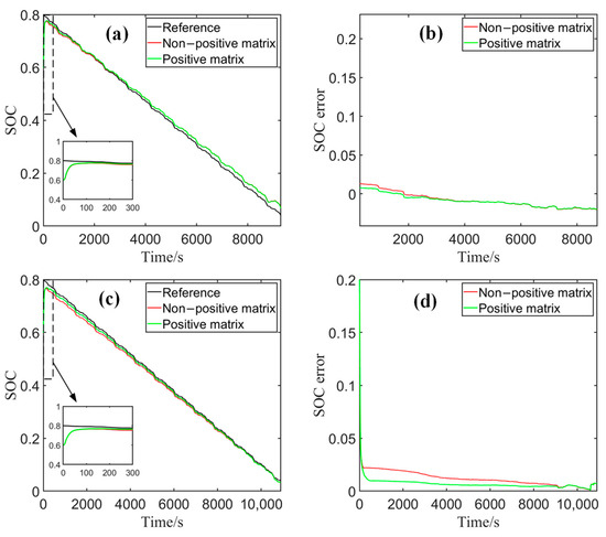 In this section, the SOC estimation at 25 °C is carried out with the configuration of the positive definite error covariance matrix for comparing the accuracy of the CKF family algorithms, including the CKF [53], ACKF [51], UR-CKF [46], and UR-ACKF. In actual working conditions, the initial SOC error occurs easily because of the capacity recovery of the battery, so it is important for the SOC estimators to have a high convergence speed for correcting an initial error quickly. Herein, to assess the correction capability of the algorithm to the initial SOC error, the initial SOC is set to 0.6, which is 0.2 lower than the actual value of 0.8. The error covariance matrix P, process noise matrix Q, and measurement noise matrix R are initially set in Equation (48).
