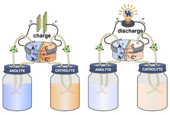 Schematic of a redox flow battery (A = anolyte; C = catholyte). In the charge process, the posolyte (catholyte) releases electrons and undergoes oxidation, while the negolyte (anolyte) gains electrons and experiences reduction. This redox reaction is reversed during the discharge process [9].