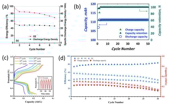 The electrochemical performance of quinone derivatives with lithium metal as the negative electrode. (a) 0.25 M 15D3GAQ in 1.0 M LiPF6/PC [26](Reprinted with permission, 2012, Royal Society of Chemistry.) (b) Charge–discharge voltage and current as a function of time with 80 mM of DB-1 (14–15 mL) [64]. (Reprinted with permission, 2012, Royal Society of Chemistry.) (c) Voltage curves of MBQ-TEMPO RFB during galvanostatic cycling at 4 mA cm−2 [65]. (Reprinted with permission, 2023, Elsevier.) (d) Efficiency, charging capacity, and discharging capacity of MBQ-TEMPO during galvanostatic cycling [65]. (Reprinted with permission, 2023, Elsevier).