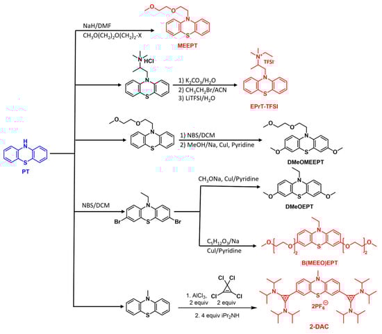 - Kaur, A.P.; Ergun, S.; Elliott, C.F.; Odom, S.A. 3,7-Bis(trifluoromethyl)-N-ethylphenothiazine: A redox shuttle with extensive overcharge protection in lithium-ion batteries. J. Mater Chem. A 2014, 2, 18190–18193. [Google Scholar] [CrossRef]