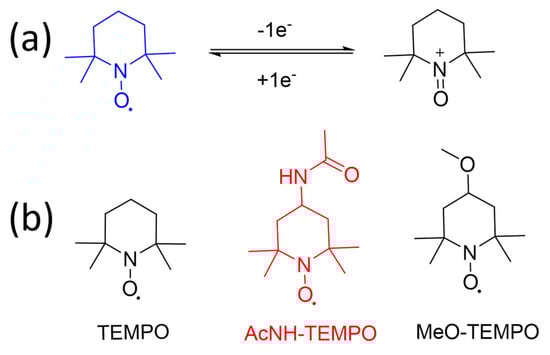 Chemical structures of TEMPO derivatives. (a) The redox process of TEMPO, and (b) Chemical structure of TEMPO, AcNH-TEMPO, and MEO-TEMPO [29,30,32].