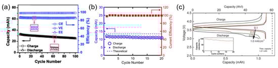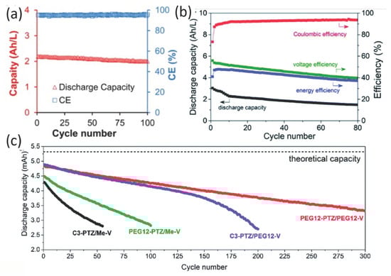 Electrochemical performance of viologen derivatives, with (a) Capacity versus cycle number of FcNTFSI/MVTFSI with a mixed electrolyte (0.1 M FcNTFSI and 0.1 M MVTFSI) for 100 cycles at 30 mA cm−2 [42]. (Reprinted with permission, 2018, Elsevier.) (b) Discharge capacity and efficiencies of 240 mM PEG12-PTZ and 100 mM PEG12-V mixed electrolytes [39]. (Reprinted with permission, 2020, Royal Society of Chemistry.) (c) Discharge capacity and efficiencies of PEG12-PTZ/PEG12-V (red), C3-PTZ/PEG12-V (violet), PEG12-PTZ/Me-V (green), and C3-PTZ/Me-V (black) [39]. (Reprinted with permission, 2020, Royal Society of Chemistry).