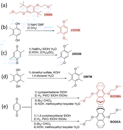 Synthesis of dialkoxybenzenes derivatives. (a) DBBB, (b) 23DBB, (c) 25DDB, (d) DMTM, and (e) BODEA [33,34,35].