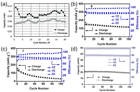 Zhang’s group assessed a variety of dialkoxybenzene derivates while in search for a structure with high capacity that retained good performance otherwise [35]. Among the 11 compounds they examined, 2, referred to as “6” and “7”, exhibited promising outcomes. These compounds, “6” and “7”, were obtained through the removal of unnecessary steric groups from DBBB, resulting in improved capacity, electrochemical performance, and solubility (Figure 8b,c and Table 5). Compound “6”, or 25DDB, displayed minimal capacity fade at 0.2% per cycle (Figure 8b and Figure 9b). On the other hand, compound “7”, or 23DDB, exhibited a higher capacity fade of 88% over 100 cycles (Figure 8c and Figure 9c). This divergence was attributed to irreversible side reactions occurring during the cycling of 23DDB.