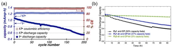 Electrochemical performance of pyridinium derivatives. (a) H-cell cycling of 5 mM of 1 and 17 in symmetric cells [89]. (Reprinted with permission, 2017, American Chemical Society.) (b) Asymmetric flow-cycling data for Py1/CP, Py1-di/CP-tri, and Py2-di/CP0tri [90]. (Reprinted with permission, 2020, John Wiley & Sons).