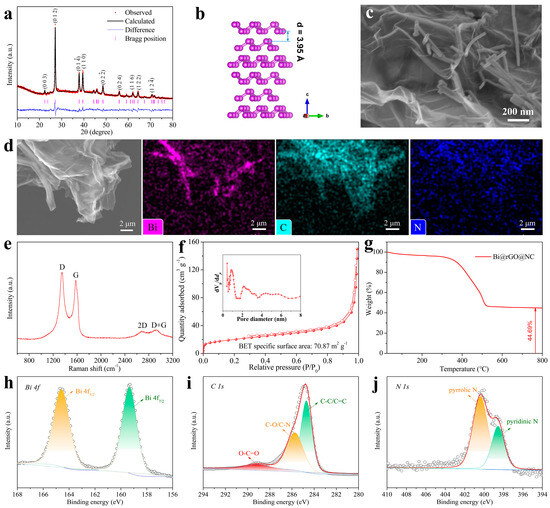 Structural and morphological characterization: (a) Rietveld refinement XRD pattern of Bi@rGO@NC; (b) crystal structure diagram of Bi; (c) FESEM image; (d) EDS mapping images of Bi@rGO@NC; (e) Raman spectrum; (f) N2 adsorption-desorption isotherm and pore size distribution (inset); (g) TGA curve; (h) high resolution Bi 4f; (i) C 1s; and (j) N 1s spectra of Bi@rGO@NC.