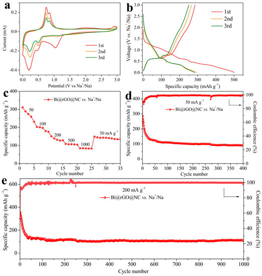 Electrochemical performances of Bi@rGO@NC for SIBs: (a) CV curves at 0.1 mV ∙s−1 and (b) discharge/charge profiles of the first three cycles at 50 mA∙g−1; (c) rate capability; (d) cycle performance at 50 mA∙g−1; and (e) at 200 mA∙g−1.