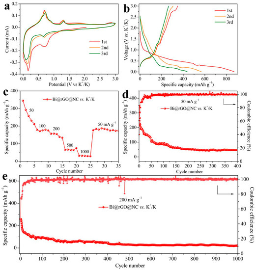 Electrochemical performances of Bi@rGO@NC for PIBs: (a) CV curves at 0.1 mV∙s−1 and (b) discharge/charge profiles of the first three cycles at 50 mA∙g−1; (c) rate capability; (d) cycle performance at 50 mA∙g−1 and (e) at 200 mA∙g−1.