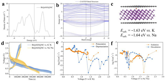 Density functional theory (DFT) based on first principles calculations was employed to evaluate the kinetics of Bi@rGO@NC for Na-/K-ion storage at the atomic level. As evidenced by the electronic density of states (DOS, Figure 4a), Bi@rGO@NC exhibits metallic behavior. Such a result demonstrates that the introduction of a double carbon layer makes Bi change from a semiconductor to a conductor [48], thus effectively adjusting the electronic structure of Bi and improving its electronic conductivity, which provides favorable conditions for alkaline-ion storage. The band structures in Figure 4b also clearly evidence its metallicity. Furthermore, the calculated adsorption energy of K+ and Na+ on Bi@rGO@NC are −1.63 eV and −1.64 eV, respectively, based on the model of K/Na-embedded Bi@rGO@NC crystal (Figure 4c), indicating the favorable tendency of thermodynamic adsorption. Therefore, it is concluded that N-doped carbon and rGO matrices enhance the electronic conductivity and Na-/K-ion adsorption capacity of Bi.