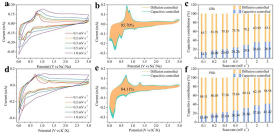 Electrochemical kinetics: (a) CV profiles at different scan rates, CV curves displaying capacity distribution (b) at 0.1 mV∙s−1 and (c) at various scan rates for SIBs; (d) CV profiles at different scan rates, CV curves displaying capacity distribution (e) at 0.1 mV∙s−1 and (f) at various scan rates for PIBs.