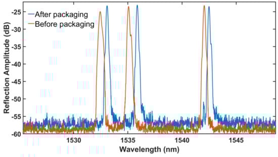 The FBGs used in the sensor system did not experience any excess stress/strain before being attached and packaged onto the battery, but while applying the glue and the epoxy, the fibers experienced a certain level of strain, as it was necessary to stretch the fiber across the curved, cylindrical surface of the battery to make sure the attachment was strong and uniform. To do so, a UV-cured spot of glue was used at several different positions along the length of the fiber, and the final coating of epoxy was then used to make the attachment stronger. This whole process created a “pre-strain” effect, so a blue shift was observed for each of the FBGs before and after packaging. However, this was not a problem, as the device was then (re-)calibrated for “zero strain” after attachment and bonding of the fibers.