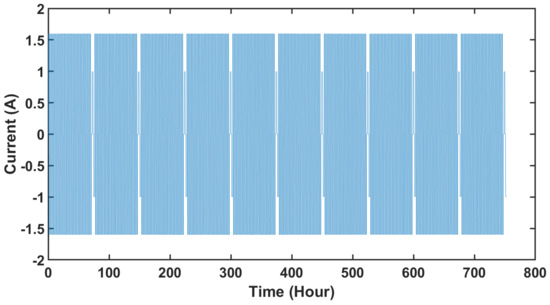 Recorded current through the battery during continuous charging–discharging cycles for ~1 month (~750 h).