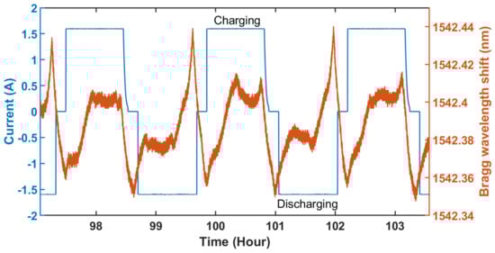 After the packaging and attachment, the instrumentation was ready for use, and the batteries were placed in an assembly and their performance measured using a constant-current/constant-voltage (CC-CV) charging procedure, followed by a CC discharge. The BTS 4000 battery test system was used for the cycling of the battery and to record the current and voltage. The corresponding current and voltage were recorded over a long period of time during consecutive charging–discharging cycles. The data from the optical interrogator system were also recorded simultaneously to measure the change in Bragg wavelengths during continuous charging and discharging cycles. The strain and temperature of the battery were expected to vary within a battery cell during the continuous charging–discharging cycles. A stable shift in the Bragg wavelengths of the sensors was found with continuous charging–discharging cycles. The Bragg reflection wavelength varies while both the strain and temperatures of the surface of the batteries are altered during charging–discharging cycles. With the charging–discharging cycles, the temperature and strain of the battery vary, which in turn alters the refractive index of the core of the fiber through the strain optic coefficient and electrooptic coefficient of the battery, resulting a stable shift in the Bragg wavelength of each sensor [39].