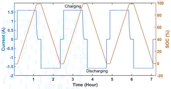 The batteries evaluated and thus instrumented with the FBG-based sensor system designed in this work were chosen for convenience and are representative of the type of battery cells used in many industrial applications, with characteristics as follows: 3.2 V, 1.6 Ah, and cylindrical LiFePO4 cells (Soshine, IFR 18650), as illustrated in Figure 2. The instrumented batteries were subjected to a series of consecutive, long charging–discharging cycles, as shown in Figure 5. During the tests carried out for calibration, the current was measured with a standard BTS 4000 battery testing unit. To ensure that the tests carried out were truly representative, the batteries were subjected to long, consecutive charging and discharging for a period in excess of one month. Figure 5 depicts the recorded current over one-month long, continuous charging/discharging cycles at a rate of 1C, which means the battery was allowed to discharge within 1 h from full capacity, and during charging, the battery would take 1 h to reach the maximum capacity from “zero” capacity. To do so, the charging current was ~1.6 A, and the discharging current was ~−1.6 A. While this was happening, the FBG wavelengths in the sensor system were also determined, and the recorded current and the Bragg wavelength of an FBG sensor during a single charging and discharging cycle are shown in Figure 6. Each of the batteries considered in this test has a sensor “package” based on a three-FBG rosette glued to the surface of the battery, and thus, the variation of each of the FBG characteristic wavelengths, varying with the change of the current, is almost similar. The FBG wavelength follows a stable, repetitive pattern, allowing the data to be used for the training of the “black-box” model. Caution was taken to synchronize the electrical and optical data over time. It is understandable due to electrochemical reactions inside the battery: both temperature and strain varied in a typical, representative manner, and the signature of both effects is reflected in the Bragg wavelengths of the FBG sensors. As mentioned earlier, at first, the SOC value was derived from the current through the battery by the Coulomb counting method (Equation (3)), where Figure 7 represents the variation of the SOC of the battery along with the current for a few charging and discharging cycles. This SOC derived from the current was used as the output of the “black-box” model, and the simultaneously recorded Bragg wavelengths of the FBG-based sensor system were used as the input. A stable and repetitive data pattern is necessary for the training of the black-box model, and this was ensured during the experiment.