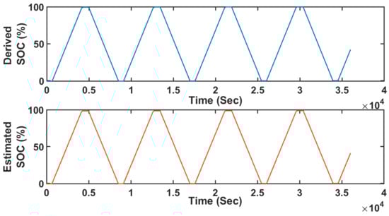 Derived SOC (%) by Coulomb counting method (top, blue graph) and estimated SOC (bottom, orange graph) during continuous charging–discharging cycles for ~4 cycles (~36,000 s).